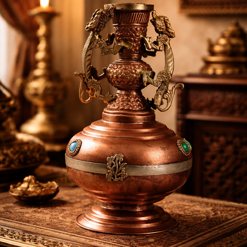 A rare ceremonial vessel where metal becomes sculpture. Hand-raised in glowing copper and crowned with cast brass serpent guardians, this kalasha embodies protection, abundance, and sacred energy. The textured repoussé body, floral medallions, and subtle gemstone inlays reflect the refined craft traditions of Western India. Both ritual object and decorative heirloom, it stands as a timeless symbol of heritage and artistry.